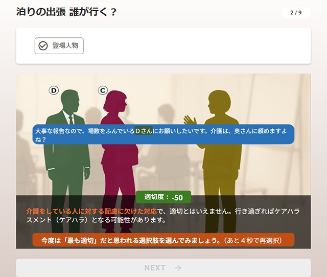 アニメーション動画やQ&A形式でわかりやすい教材学術的な一般論ではなく、ビジネスシーンの事例を視覚的に理解できるよう工夫しています。丁寧な解説と、イラストの視覚的なサポートで、受講者の学習の負担感は下げ、理解度を上げることのできるeラーニング教材です。 - POINT ②