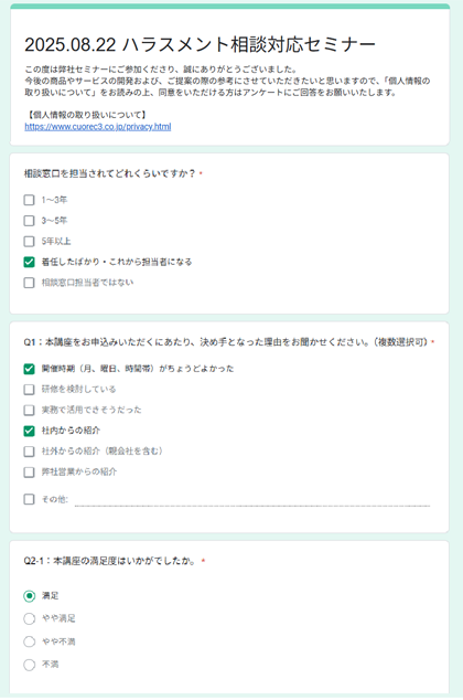 - ハラスメントに関するセミナーを受けるのは初めてでしたが、わかりやすい内容で今後の業務に活かせると思いました。