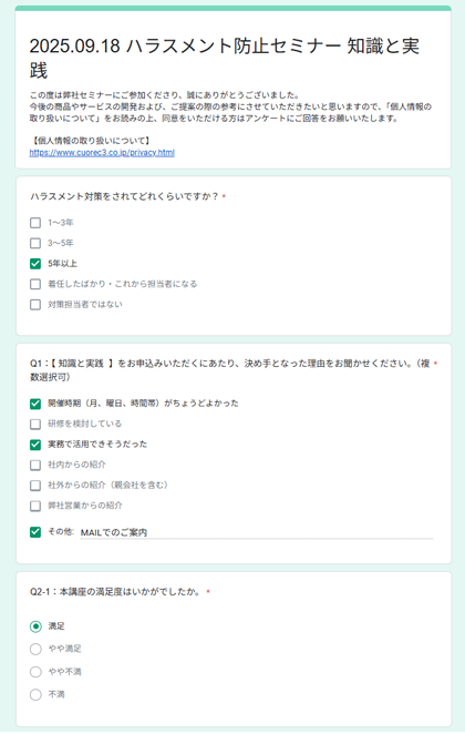 - 幅広くハラスメント問題に関する知識を得られたことと、他業種の方との関わりができたことが良かったです。