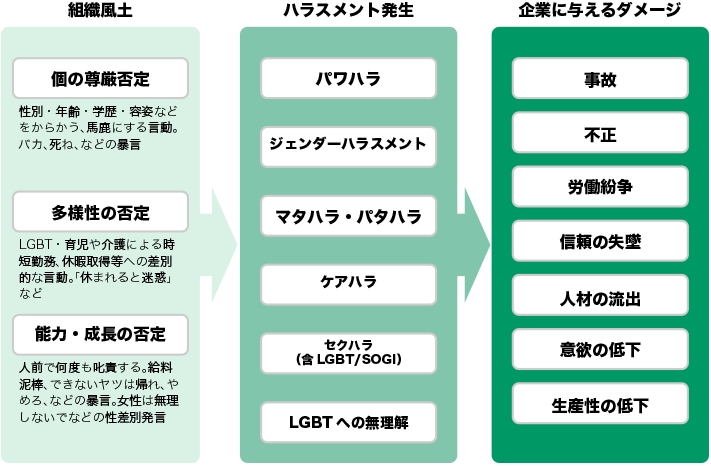 ハラスメント問題は、どのような業界、業種、業態でも起こり得ます。「自社にそんなひどいことをする人はいない」と思っても、人間関係の軋轢や世代間ギャップ、誤解からくる不信感などが募れば、大きな問題に発展します。その現実を直視することなく放置してしまうような組織風土では職場崩壊を起こし、企業の存続も危うくなります。