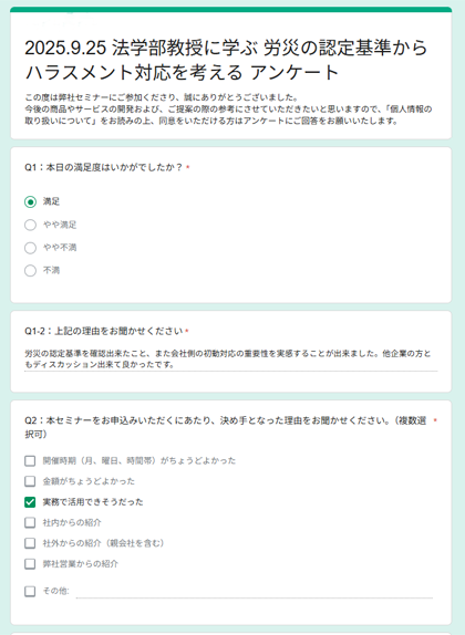 - ハラスメント対応で求められる考え方を詳細に学べ、且つ講師に直接質問をする時間が長くとられており、とても有意義でした。